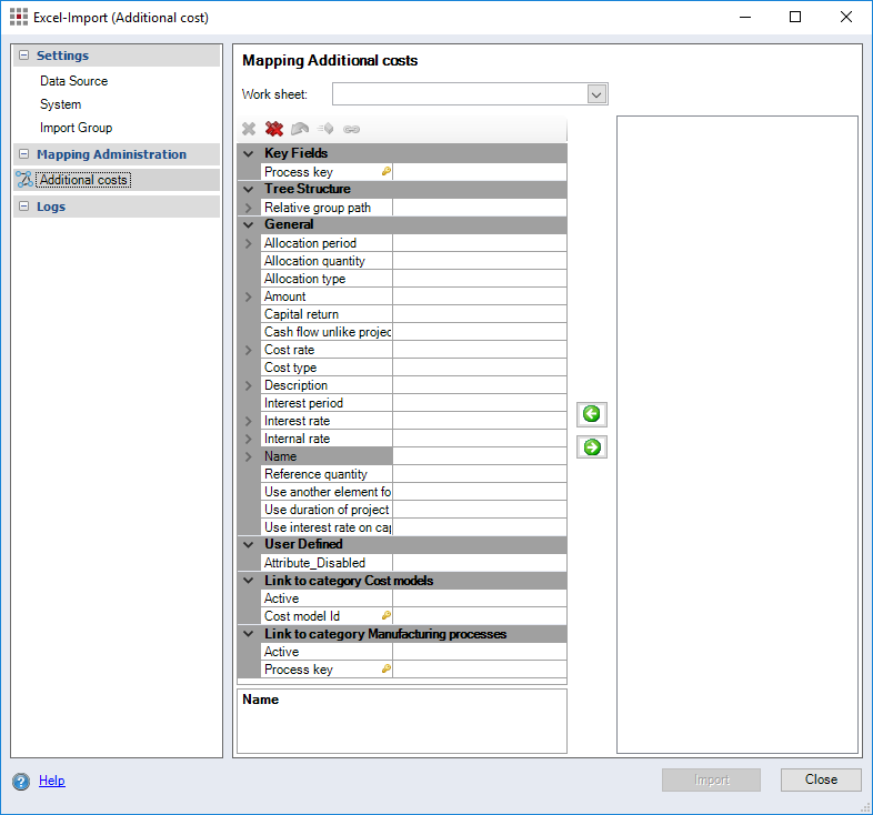 Figure: Excel Import (Additional Costs) dialog, Mapping Additional Costs