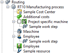 Processes can be added in the project structure under assemblies or under manufacturing parts. Processes assigned to a routing are called operations. The following resources can be added to a process: