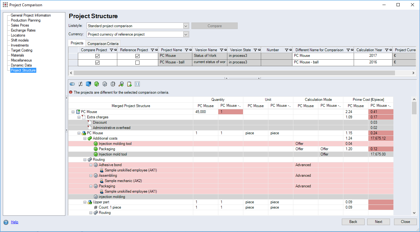 The dialog enables you to compare the properties of multiple projects or versions. The dialog contains of the same categories as the Project Cockpit.