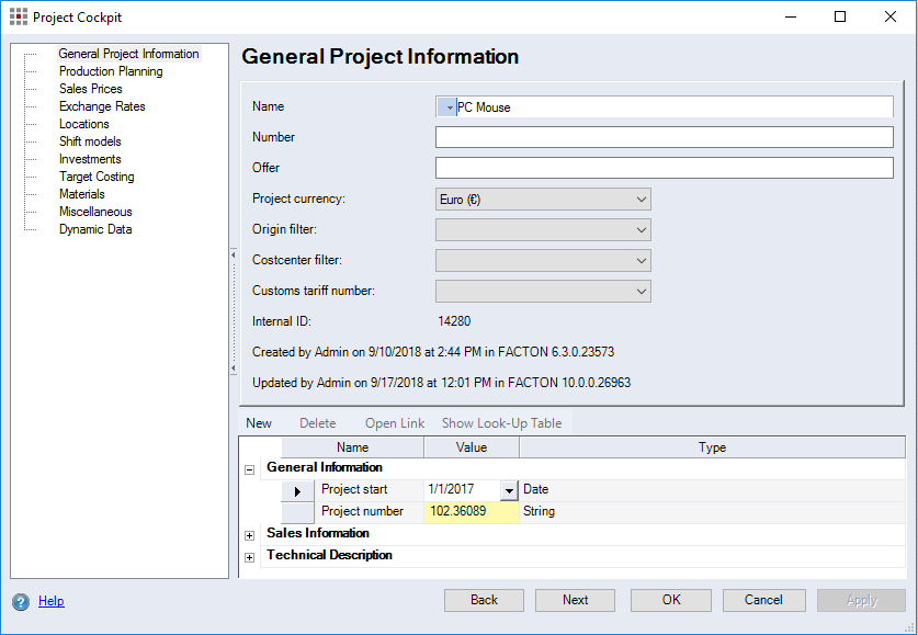 | Production Planning | The production planning category allows you to change the chronological dependencies of a project (e.g. project start or project duration) and the quantities. | Production planning for a project |