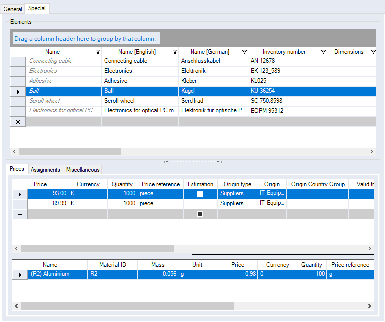| Price | Enter the price for which the purchased or standard part is available according to the given quantity and period. |