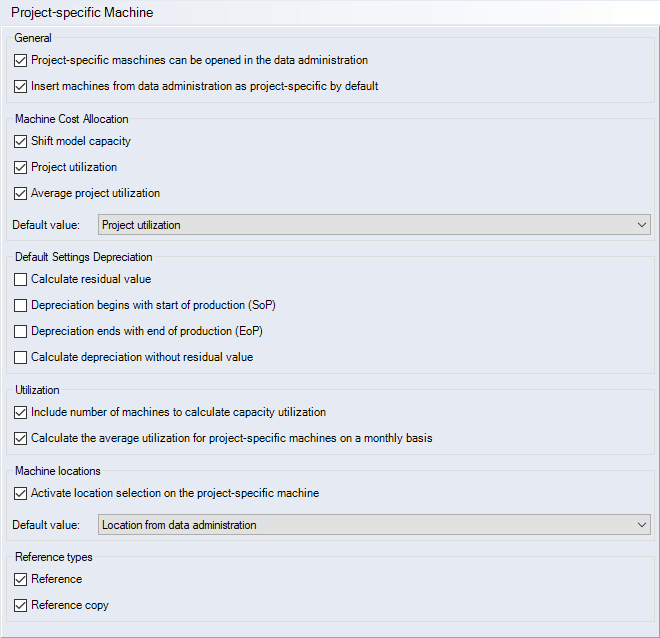 | »Deprecation begins with start of production (SoP)« checkbox | Define the depreciation period. If you activate the checkbox, the depreciation period will derive from the project period. Deactivate the checkbox to use the value from Data Administration (if available) as the default depreciation period. |