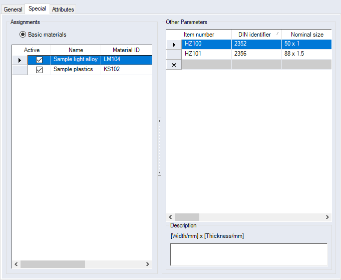 Basic materials | Multiple basic materials can be added and multiple ones be actively assigned. Each semifinished part consists of at least one basic material. You must edit the validity depending properties of a semifinished part for each basic material separately. |