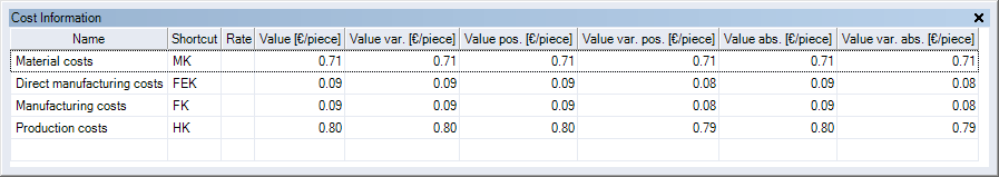 | Value var. | Shows the variable share of the value of the cost element per unit. |