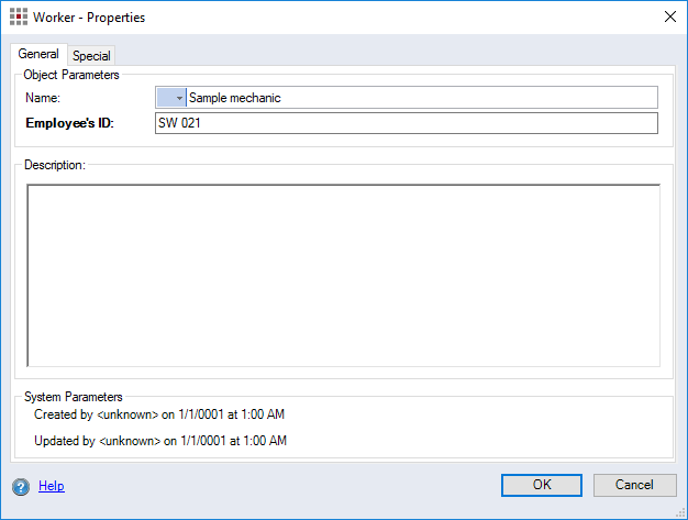 The "General" tab contains the master data for the project-specific worker – the name, employee's ID and an worker description.