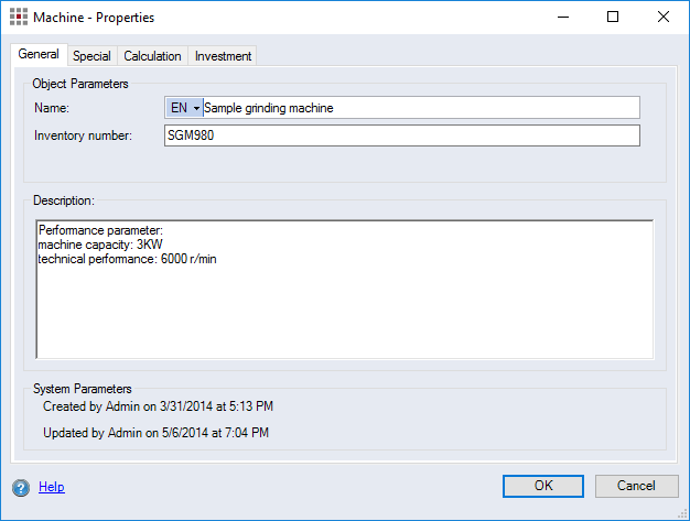 The "General" tab contains the master data for the machine - including the name, the inventory number and a description of the machine.