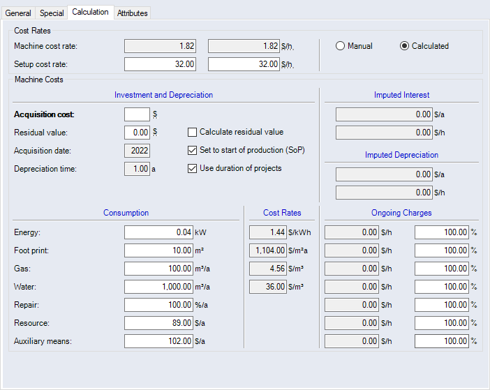 The relevant costs for machine allocation are defined on the "Calculation" tab.
