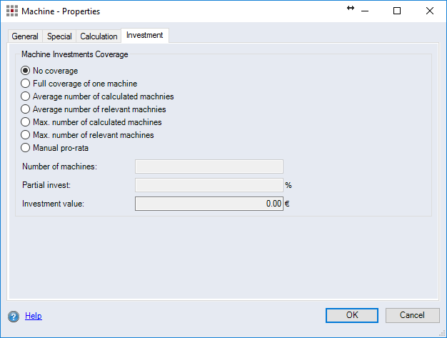 In this group, define what portion of replacement costs should be included as an investment. The result of the difference of replacement costs and the portion of replacement costs not used in costing is multiplied by a factor you selected in advance. The replacement costs appear in the "Investment" category dialog.