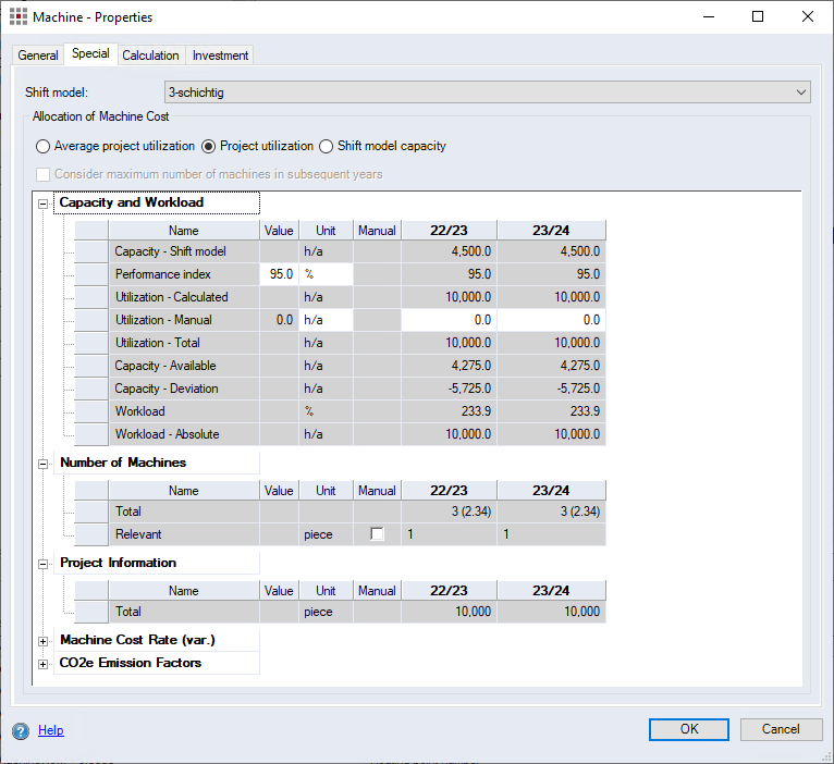 This level shows the machine capacity, utilization and workload for the duration of the project, i.e. for each calculation year.