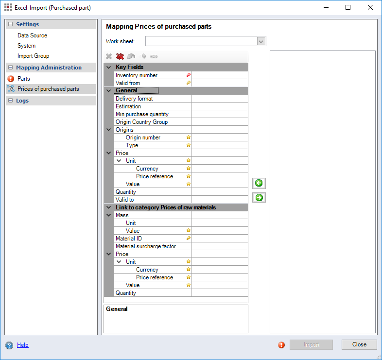 Figure: Excel Import (Purchased Part) dialog, Mapping Prices of Purchased Parts
