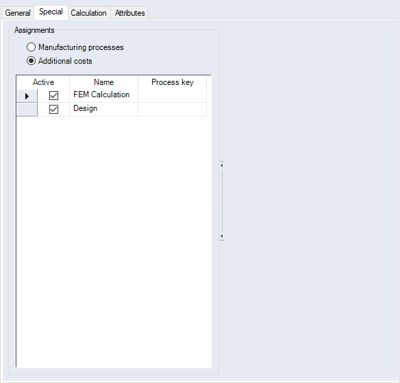 Multiple manufacturing processes can be added and multiple ones can be actively assigned. You cannot assign the same manufacturing process multiple times. If a cost model with assigned manufacturing process is inserted in a project, you can use the "Technology" calculation mode Here, the times for different activity types (machine, worker, setup) are calculated in the project. |