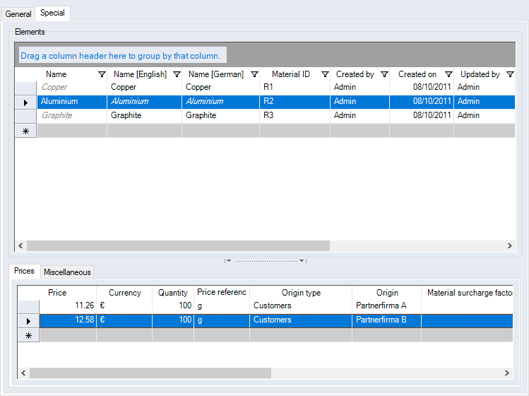 This table is used to create, display and edit the prices and quantities of a selected raw material from the upper table.