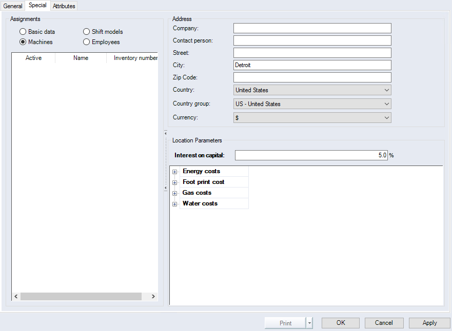 You can link multiple machines to the location. This allows the calculation of the machine costs to take costs for a particular location into account.