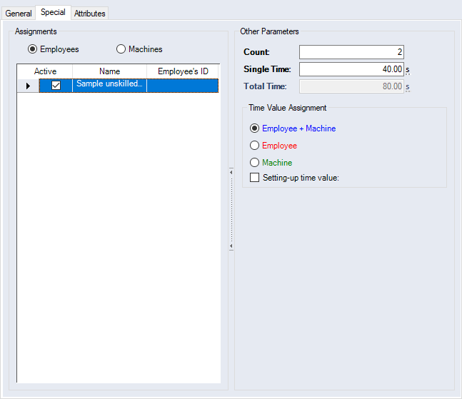 | Worker + Machine | Assign the single time value to a machine and a worker |