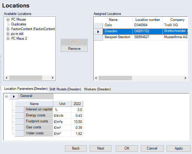 All locations that have already been added to the project are displayed here including their master data. The master data can be edited in the table. When you select a location, its calculation parameter data is displayed in the "Calculation Parameter" group.