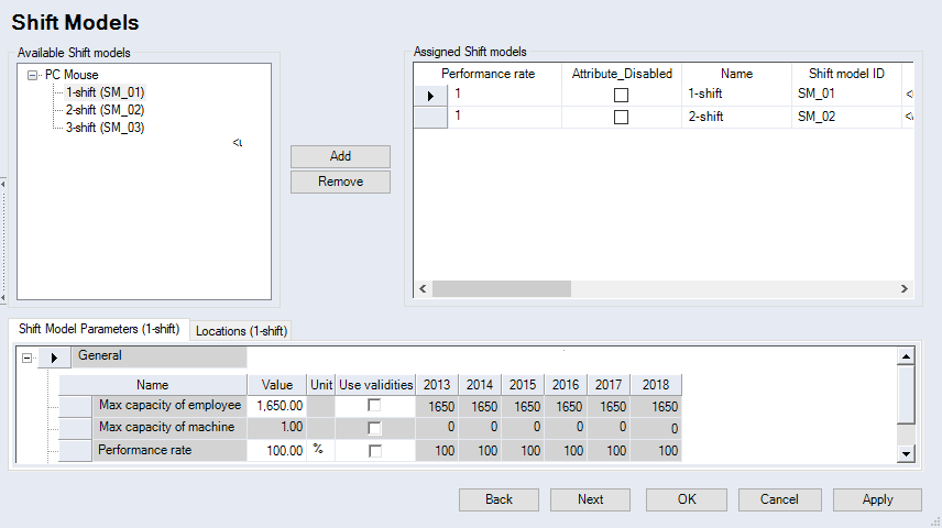 | Name | Shows the name of the shift model parameter for the investment and machine calculation. |