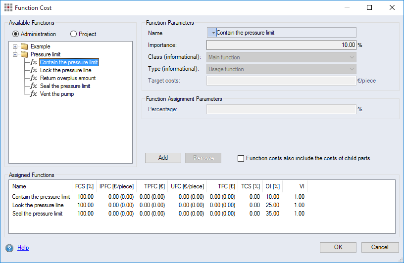 Please note that the percentage value for the "Importance" of a function must always result in 100% of the main and the sub-functions.