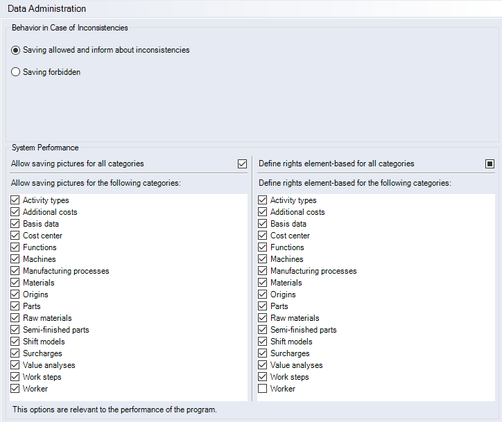 You can improve the performance of your system in this group. You specify whether it should be possible to attach images and assign rights to individual calculation elements in Data Administration.