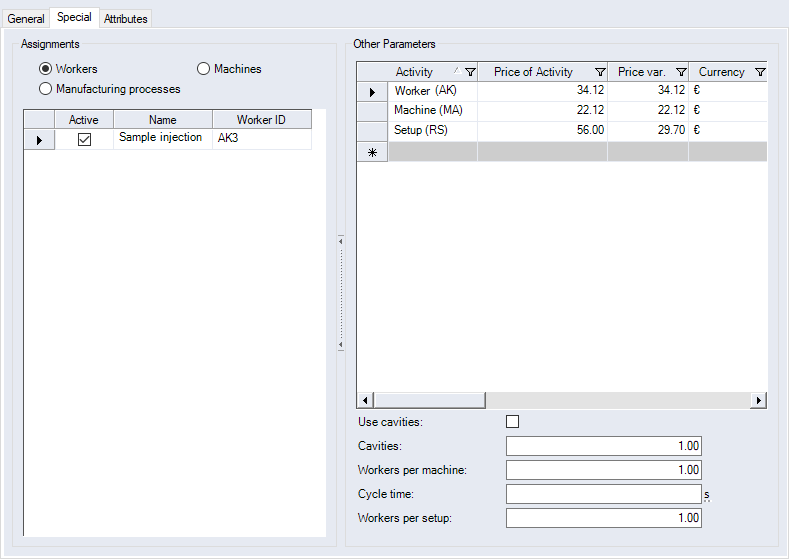 | Use cavities | When the checkbox is activated, the use of cavities is automatically activated when the cavities are retrieved from the cost center using the "Cost Center" calculation mode . |