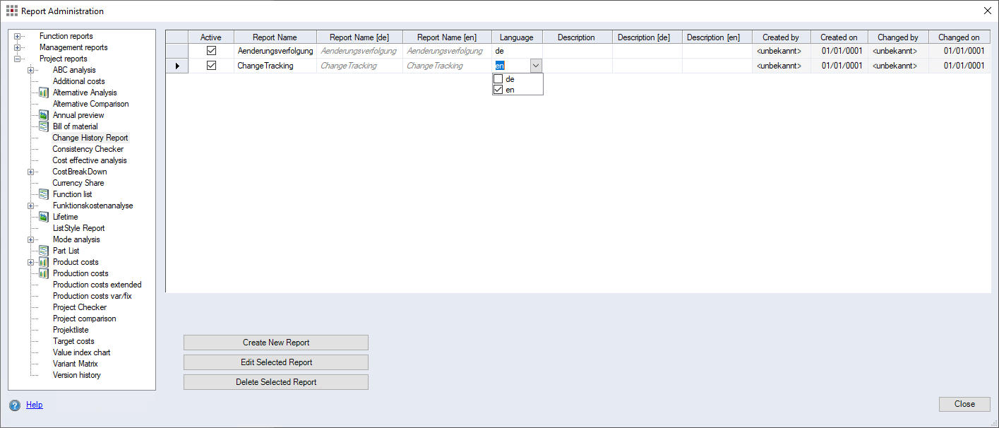 | Active | An activated checkbox indicates the currently used report template for the highlighted report group. |