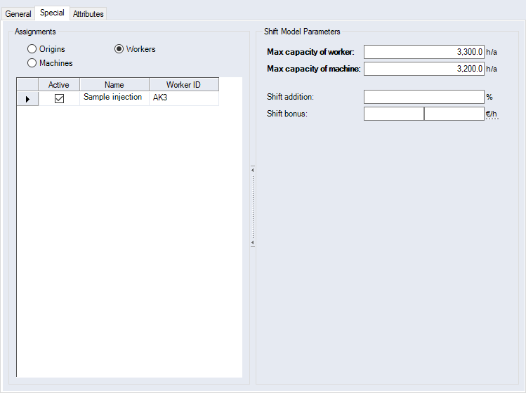 Workers Multiple workers can be added and multiple ones can be actively assigned. The assignment enables the assumption of information on the maximum capacity of the worker, i.e. workers with a calculated cost rate require a shift model.