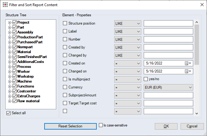 For the "Production costs var/fix" project report, you can also use the "Filter and Sort Settings" tab to define the project level depth in the report output, see example For project reports with data channel FactonNET.Reportsystem.MultiProjectFilteredStructureReport and FactonNET.Reportsystem.Jahresvorschaustrukturreport you can define the number of project levels to be displayed in the report (fixed limit, no limit, user-specific)..