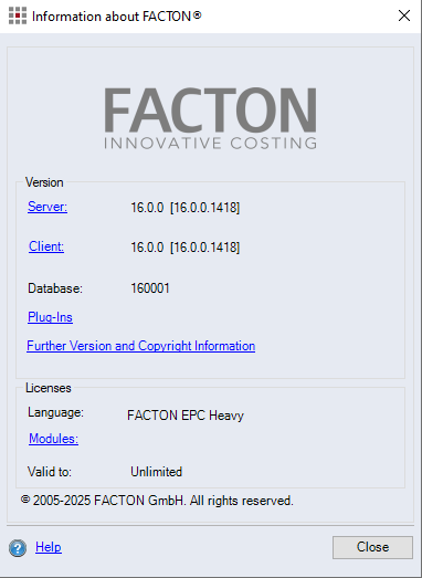 The "Information about FACTON®" dialog displays the version numbers of the FACTON server and clients, the installed plugins, the database and the license currently in use.