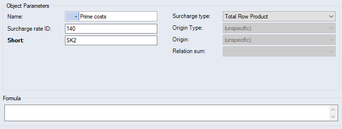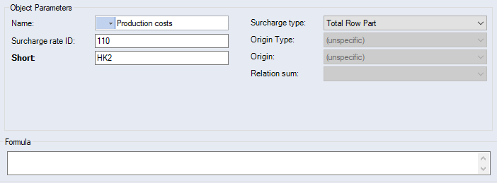 At the project level, only the surcharge type "Total row product" can be added. To do this, the entry "Cost definition" must be selected in the "Surcharge on" combobox, and the abbreviation of the desired surcharge rate with "Total row product" of the "Type" combobox must be entered in the "Formula" input field.