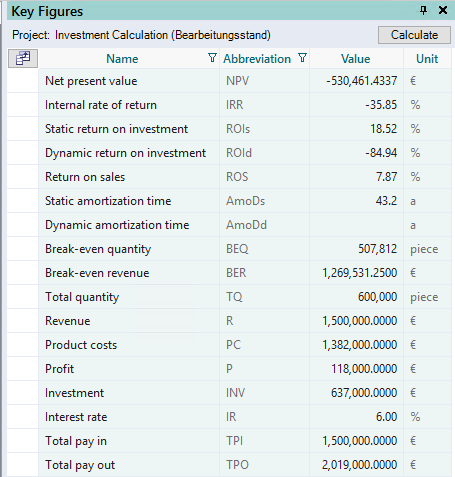 The key figures of the static and dynamic investment calculation are calculated and displayed read-only.