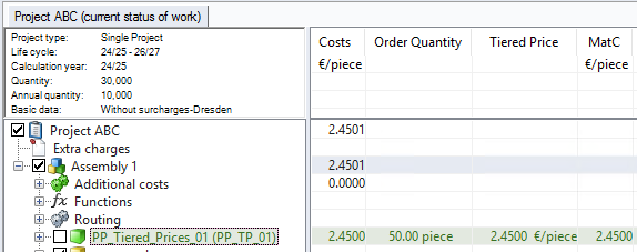 You can embed parts for which you have maintained tiered prices in your single project as usual via the assignment dialog, see Table of quantities, validities and prices.