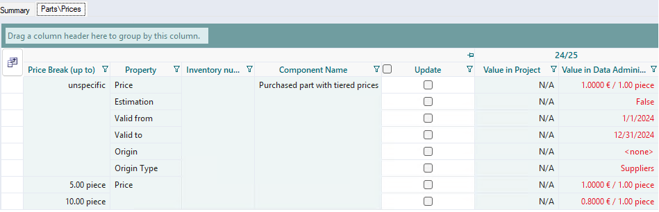 Price differences of the 2nd table level (tiered prices) are listed separately per price break (in an own column) and tiered price (in the column "Value in Data Administration") for each component.