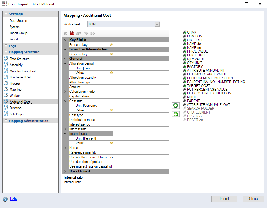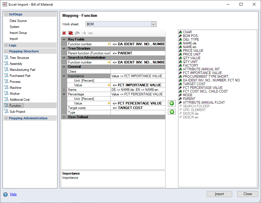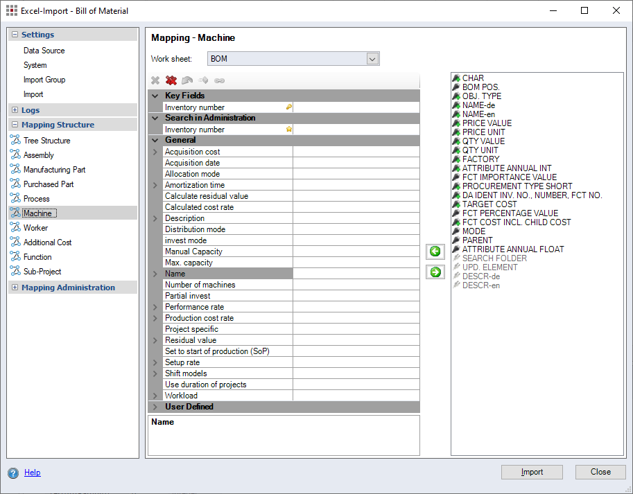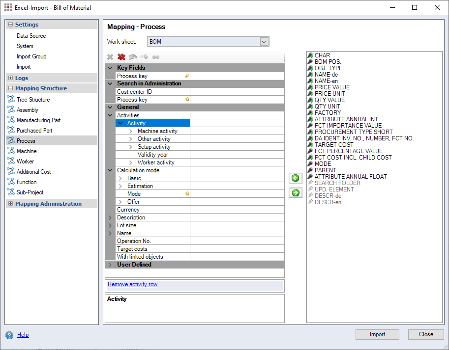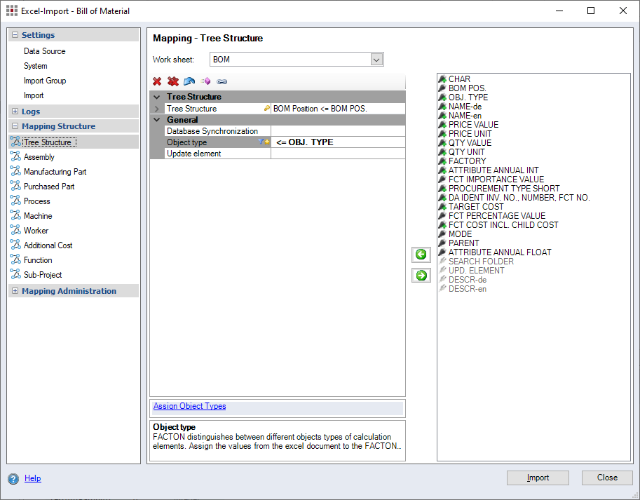 In the "Mapping Structure" area, you can find the object types in categories for the BOM import.