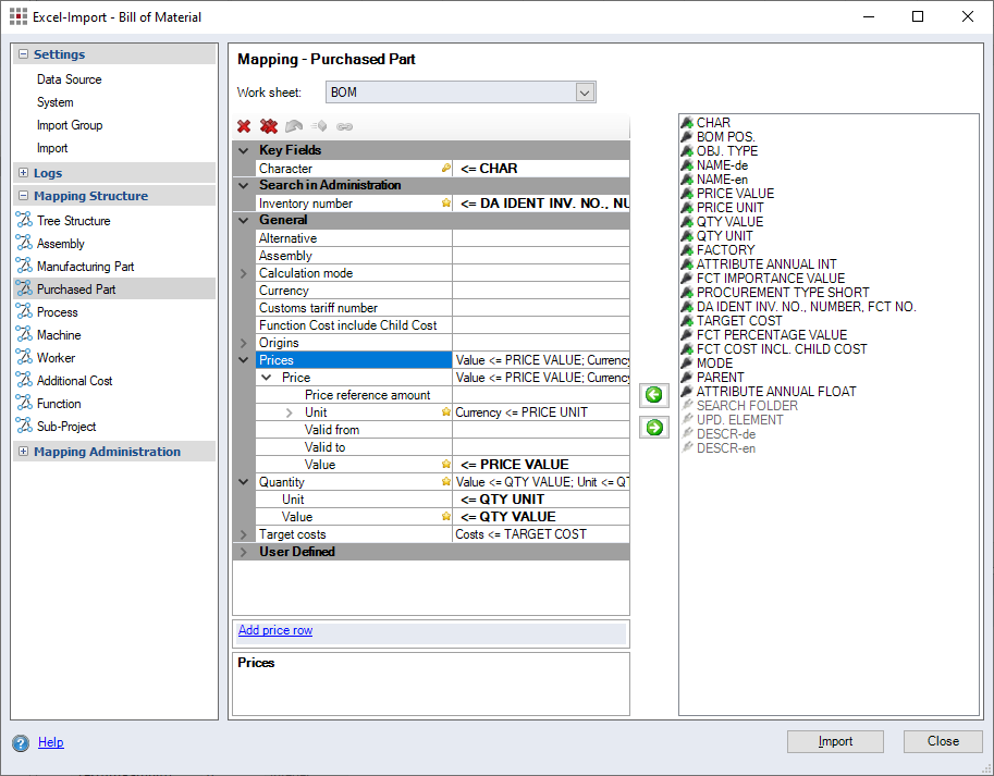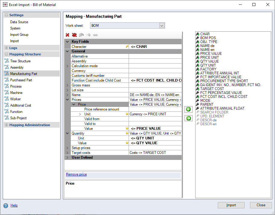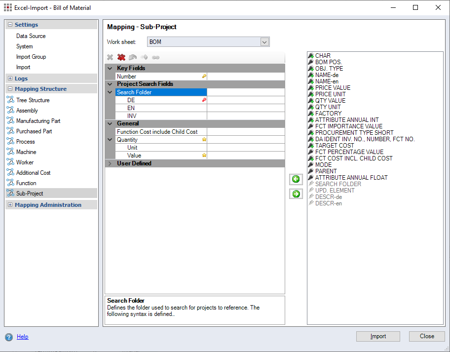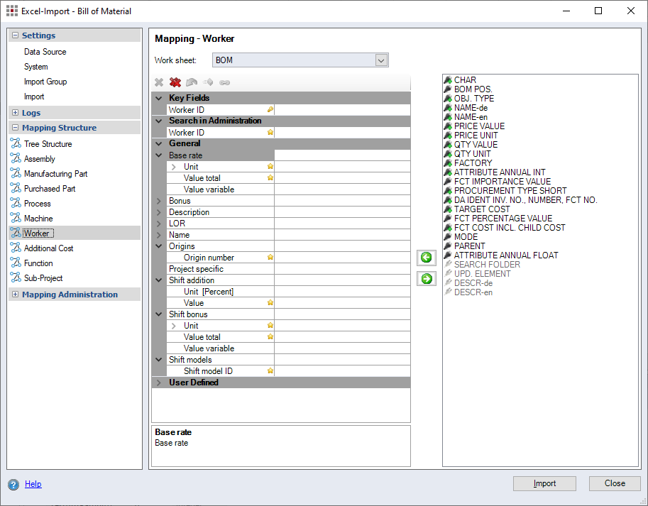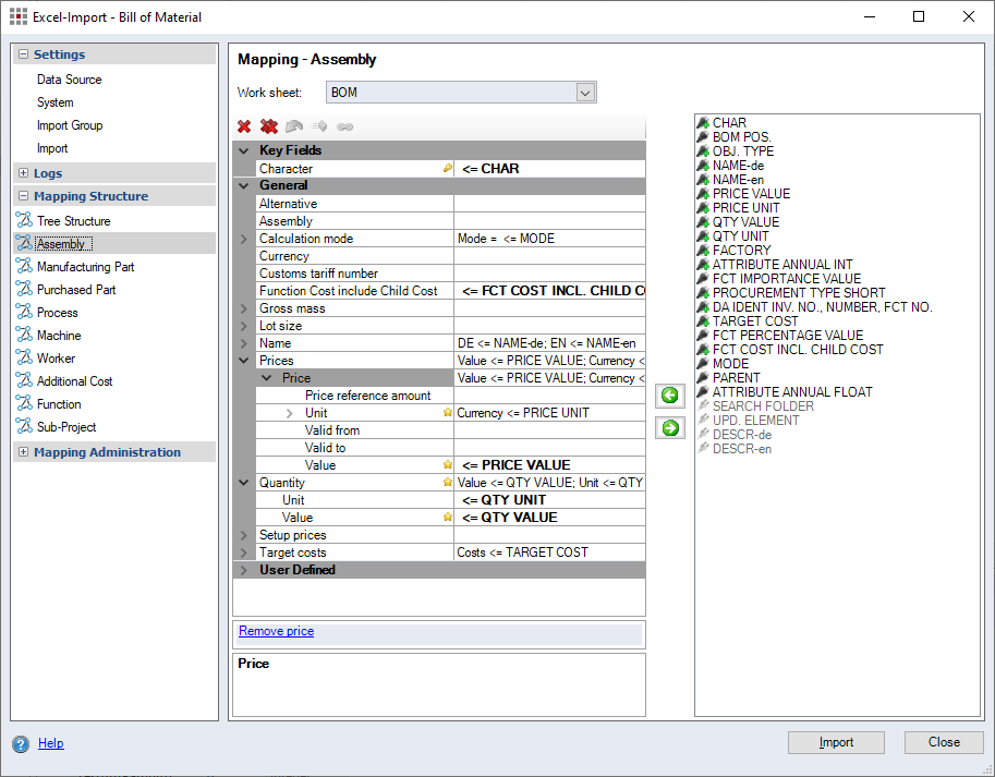 In the "Mapping Structure" area, you can find the object types in categories for the BOM import.