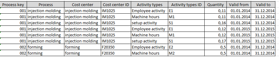 You must at least enter the process, the cost center ID, and the activity type ID in each row in Excel.