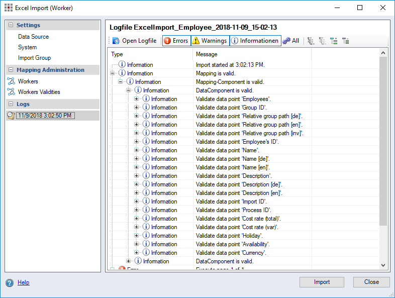 <enter date and time> in the Logs category.The Excel import log file opens.