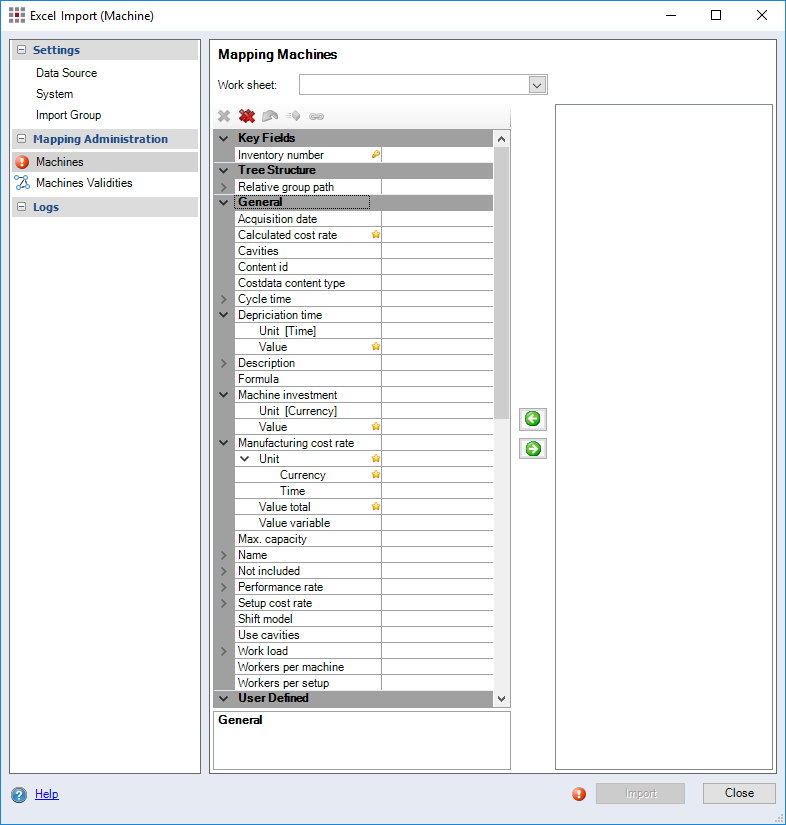 Figure: Excel Import - Machines dialog, Mapping Machines Validities