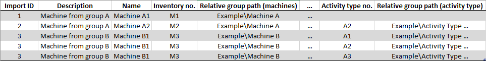 The picture illustrates how link relationships are structured within the Excel file using the example of "Machines – Activity types". Machine B1 can be found three times with identical critera in the workbook. The activity type number for the activity type search is different every time. The machine is linked with all three activity types during the import.