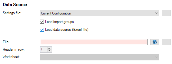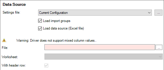 The "Data Source" group in the "Excel Import" dialog is displayed differently depending on the Excel data driver set.