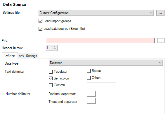 Activate the checkbox for the separator you wish to use to separate the contents of the Excel file. The text delimiters "Tabulator", "Semicolon", "Comma" and "Space" are available.