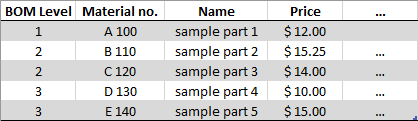 Parts with a higher BOM level are imported under the last imported assembly whose BOM level is exactly one unit less than the imported part's level. For example, parts with a BOM level of 4 are inserted into the last assembly with BOM level 3.