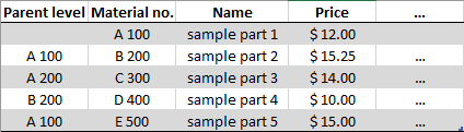 NoteOnly parts or processes located within the same Excel workbook can be specified as parent parts. The material numbers for parts that already existed in the project prior to the import cannot not be specified as parents.