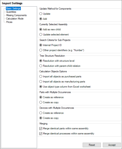 Figure: Excel Import - Bill of Material dialog, Import Settings category - Calculation Mode