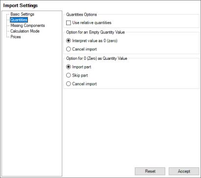 Figure: Excel Import - Bill of Material dialog, Import Settings category - Quantities