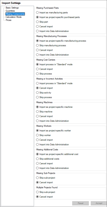 Figure: Excel Import - Bill of Material dialog, Import Settings category - Missing Components