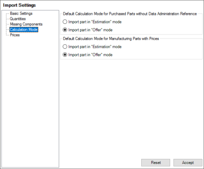 Select this option to create purchased parts in "Estimation" mode in the project if no other mode or the automatic calculation mode is entered in the import assignment.