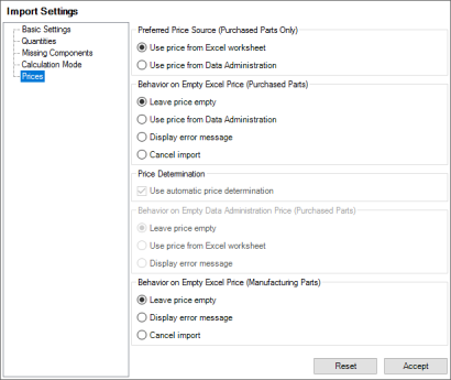 Activate this checkbox to enable automatic price determination. Automatic price determination is enabled whenever both Data Administration price and the Excel price are empty. In that case, the prices are determined using the import settings. When the checkbox is deactivated, a manual "Standard" mode is imported that cannot be modified during the database synchronization process, but only using the "Check Purchased/Standard Part" dialog.