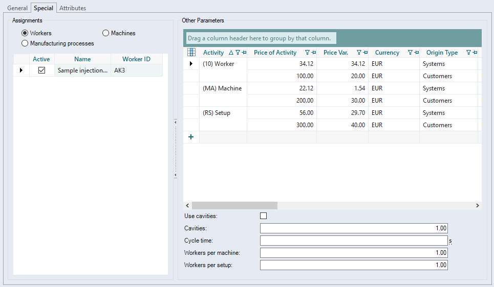 | Use cavities | When the checkbox is activated, the use of cavities is automatically activated when the cavities are retrieved from the cost center using the "Cost Center" calculation mode . |