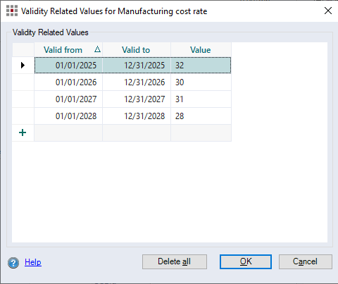 Figure: Validity Related Values for Manufacturing Cost Rate Dialog