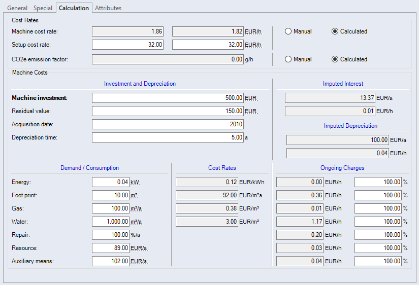 In the "Calculation" tab you can have machine cost rates calculated or enter them manually, as well as enter further calculation parameters of the machine cost.