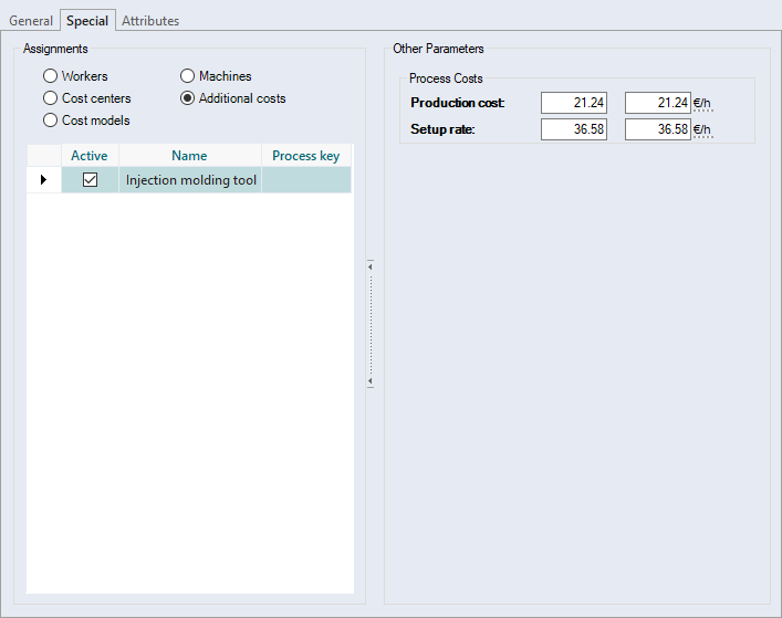 Only one cost model can be linked and actively assigned. If the manufacturing process with the assigned cost model is added to a project, the process is automatically evaluated in "Technology" calculation mode The same applies to imported processes (see "Excel Import - Manufacturing Process" dialog) and processes from standard routings (see Standard Routing ), provided that they have assigned cost models. |